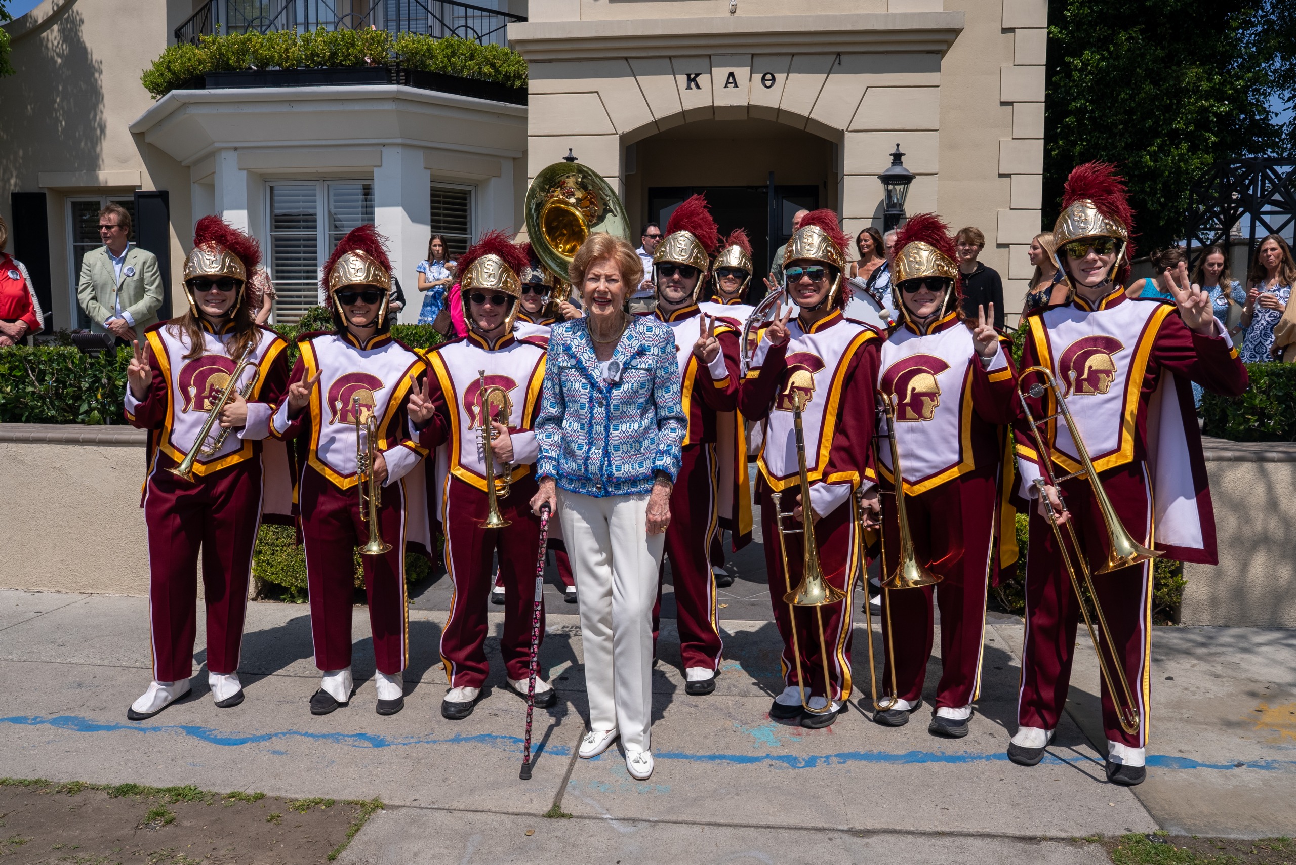 Almost 68 years after graduating from USC, Life Trustee Kathleen Leavey McCarthy returned to campus Sunday afternoon. The Trojan Marching Band serenaded her as part of a surprise 90th birthday celebration hosted at the house of her sorority, Kappa Alpha Theta.